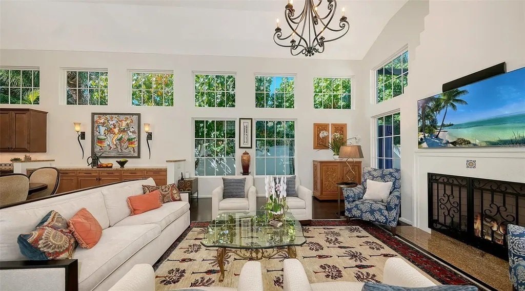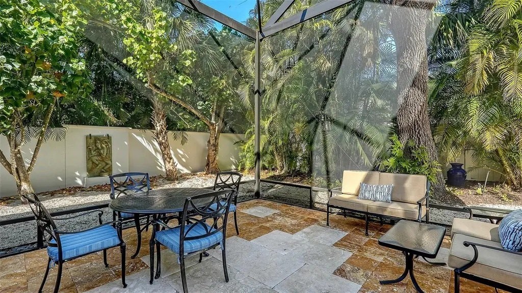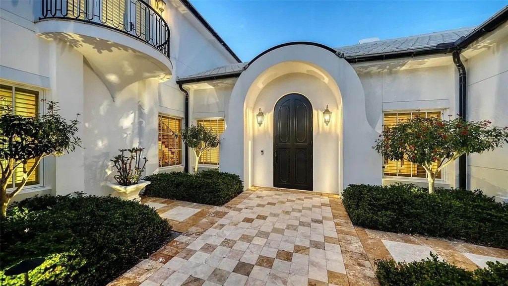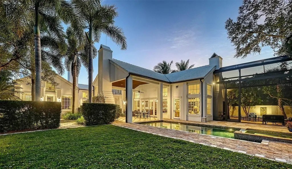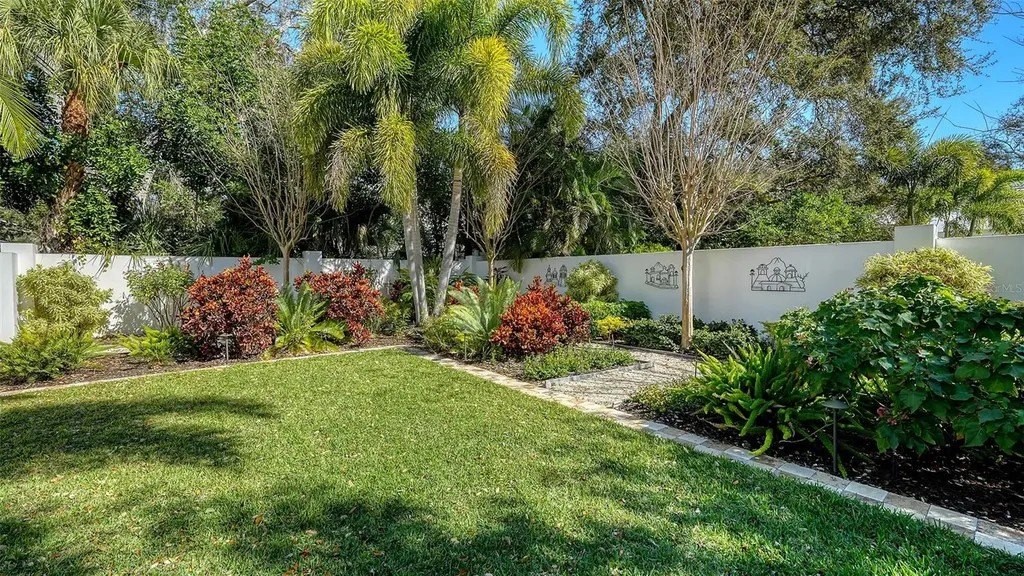Recipient of eleven awards, including Residential Design and Build Design Excellence and Home of the Year by SRQ Magazine, this exceptional residence is the result of a thoughtful collaboration between Jonathan Parks Architect and Michael A. Gilkey Inc landscape designer. Located in one of Sarasota's oldest and most established neighborhoods, the home seamlessly blends a traditional 1920s architectural vocabulary with a modern appreciation for simplicity and precision. The result is a sophisticated four-bedroom residence with a British Colonial sensibility-elegant, timeless, and thoughtfully designed for today's lifestyle. Set on an unusually large 20,000-square-foot lot and located outside of any flood zone, the property offers a rare sense of space and privacy. An artistic pool and a series of designated outdoor living areas, framed by curated garden vignettes, complete this tranquil retreat. The striking foyer welcomes you with understated elegance, gleaming wood floors, and an immediate sense of refinement. Walls of glass define the main living spaces, filling the interior with natural light and highlighting the fireplace as a focal point. While the classic elements of a traditional home remain-stucco exterior, white roof, and ironwork details-the overall aesthetic is contemporary and quietly confident. Large windows and an open floor plan are designed to maximize light and create a seamless connection to the outdoors. A spacious screened patio offers an inviting setting for both relaxation and al fresco dining. Mature Mahoe trees, native to South Africa, line the exterior and rise gracefully to the level of the home's high windows, enhancing privacy and serenity. The primary suite occupies its own private wing on the first floor, complete with a secluded courtyard, while an ensuite guest bedroom and office balance the opposite wing. Upstairs, two additional ensuite bedrooms each enjoy private balconies overlooking the lush grounds. Throughout the home, a Zen-like sense of peace and tranquility prevails-a true sanctuary of thoughtful design and quiet luxury.