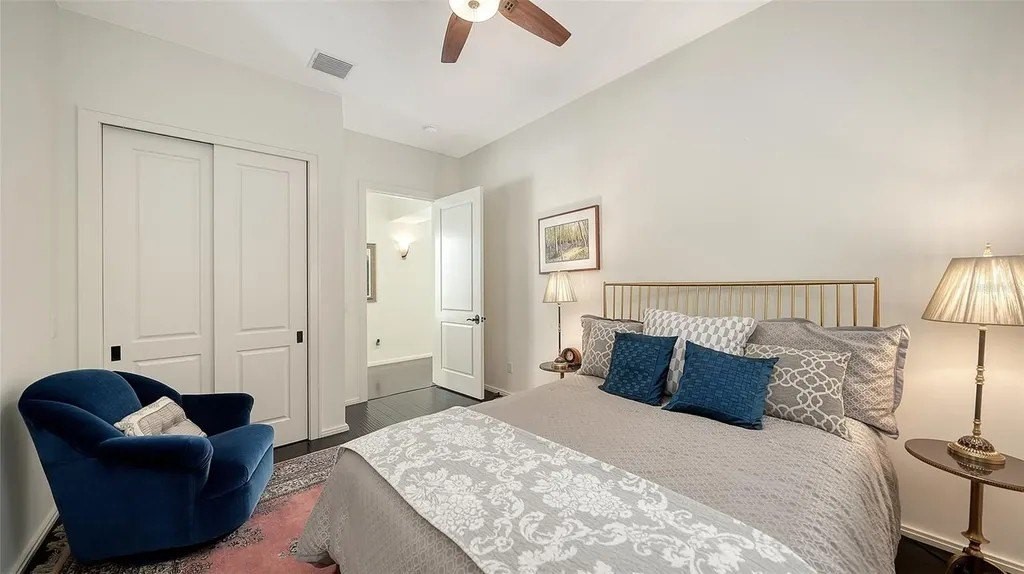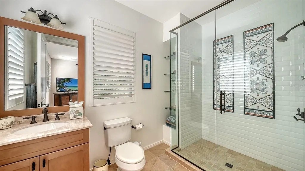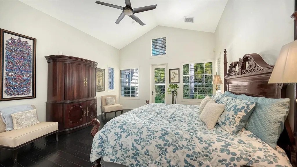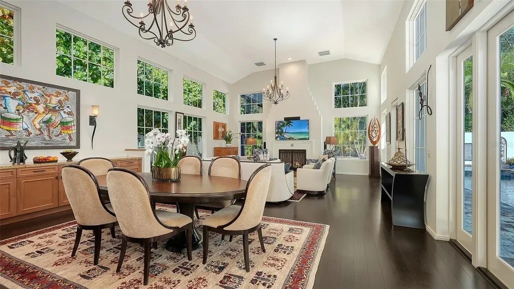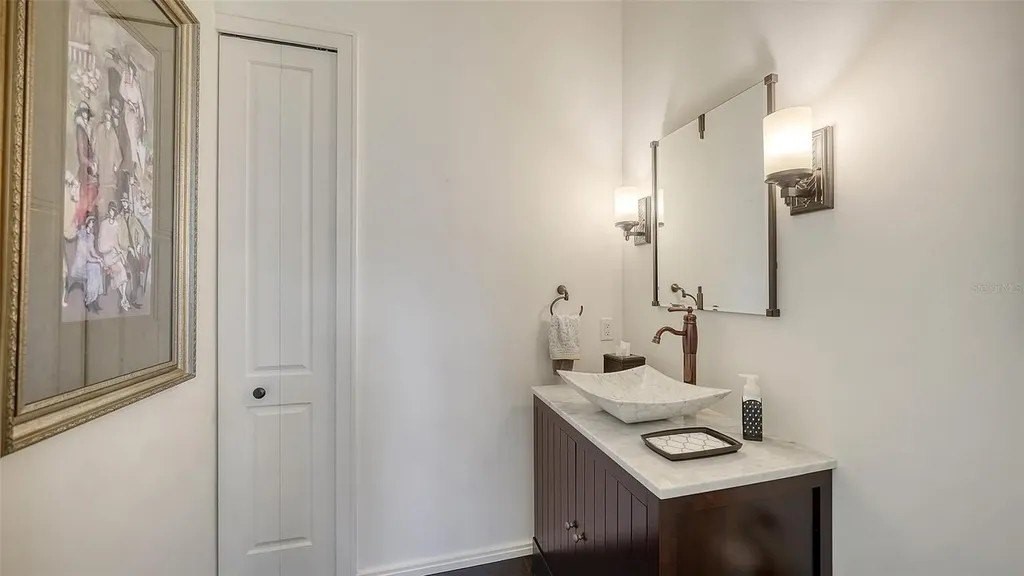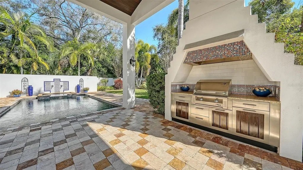 Recipient of eleven awards, including Residential Design and Build Design Excellence and Home of the Year by SRQ Magazine, this exceptional residence is the result of a thoughtful collaboration between Jonathan Parks Architect and Michael A. Gilkey Inc landscape designer. Located in one of Sarasota's oldest and most established neighborhoods, the home seamlessly blends a traditional 1920s architectural vocabulary with a modern appreciation for simplicity and precision. The result is a sophisticated four-bedroom residence with a British Colonial sensibility-elegant, timeless, and thoughtfully designed for today's lifestyle. Set on an unusually large 20,000-square-foot lot and located outside of any flood zone, the property offers a rare sense of space and privacy. An artistic pool and a series of designated outdoor living areas, framed by curated garden vignettes, complete this tranquil retreat. The striking foyer welcomes you with understated elegance, gleaming wood floors, and an immediate sense of refinement. Walls of glass define the main living spaces, filling the interior with natural light and highlighting the fireplace as a focal point. While the classic elements of a traditional home remain-stucco exterior, white roof, and ironwork details-the overall aesthetic is contemporary and quietly confident. Large windows and an open floor plan are designed to maximize light and create a seamless connection to the outdoors. A spacious screened patio offers an inviting setting for both relaxation and al fresco dining. Mature Mahoe trees, native to South Africa, line the exterior and rise gracefully to the level of the home's high windows, enhancing privacy and serenity. The primary suite occupies its own private wing on the first floor, complete with a secluded courtyard, while an ensuite guest bedroom and office balance the opposite wing. Upstairs, two additional ensuite bedrooms each enjoy private balconies overlooking the lush grounds. Throughout the home, a Zen-like sense of peace and tranquility prevails-a true sanctuary of thoughtful design and quiet luxury.